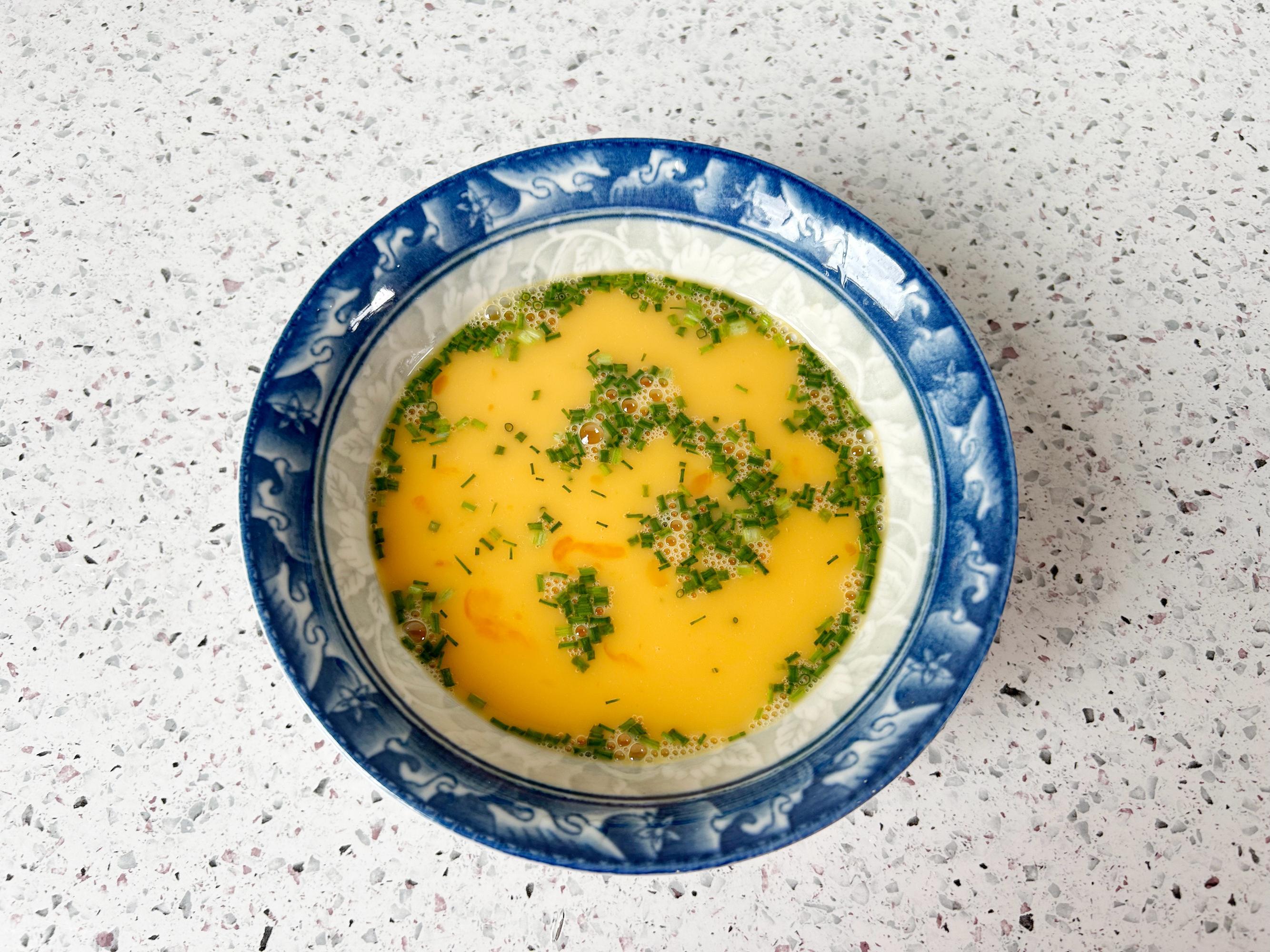 雞蛋去殼,蛋清和蛋黃充分攪拌均勻,加一勺料酒和適量的鹽調味,加入香蔥葉子混合均勻。加料酒既可以去腥,又可以讓煎出來的雞蛋更香嫩。