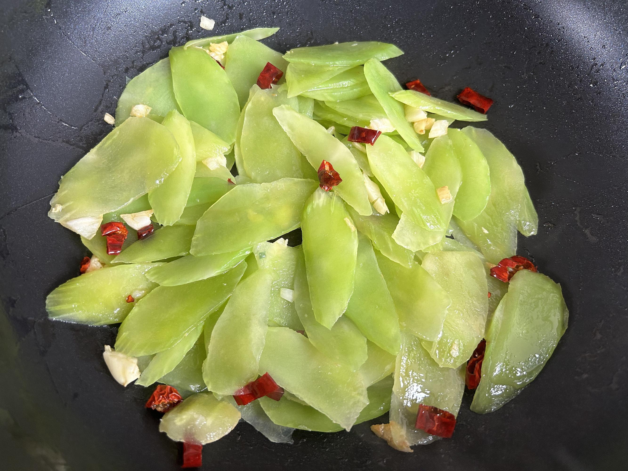 鍋裏重新放油,放入大蒜和幹辣椒熗鍋,加入萵筍翻炒到斷生。