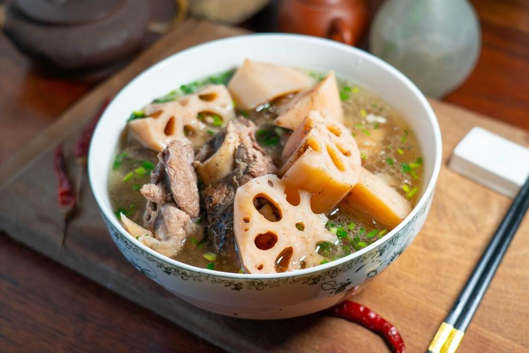 蓮藕洗淨後,削皮切塊,排骨下鍋焯一下水,隨後撈出來備用,緊接着準備好乾淨鍋子,把排骨、薑片倒進去,添上足量的清水來燉,燒開後燉半個小時,再把蓮藕放進去,繼續燉半個小時,最後加入鹽、白胡椒粉調味,然後撒上蔥花,出鍋開喝。
