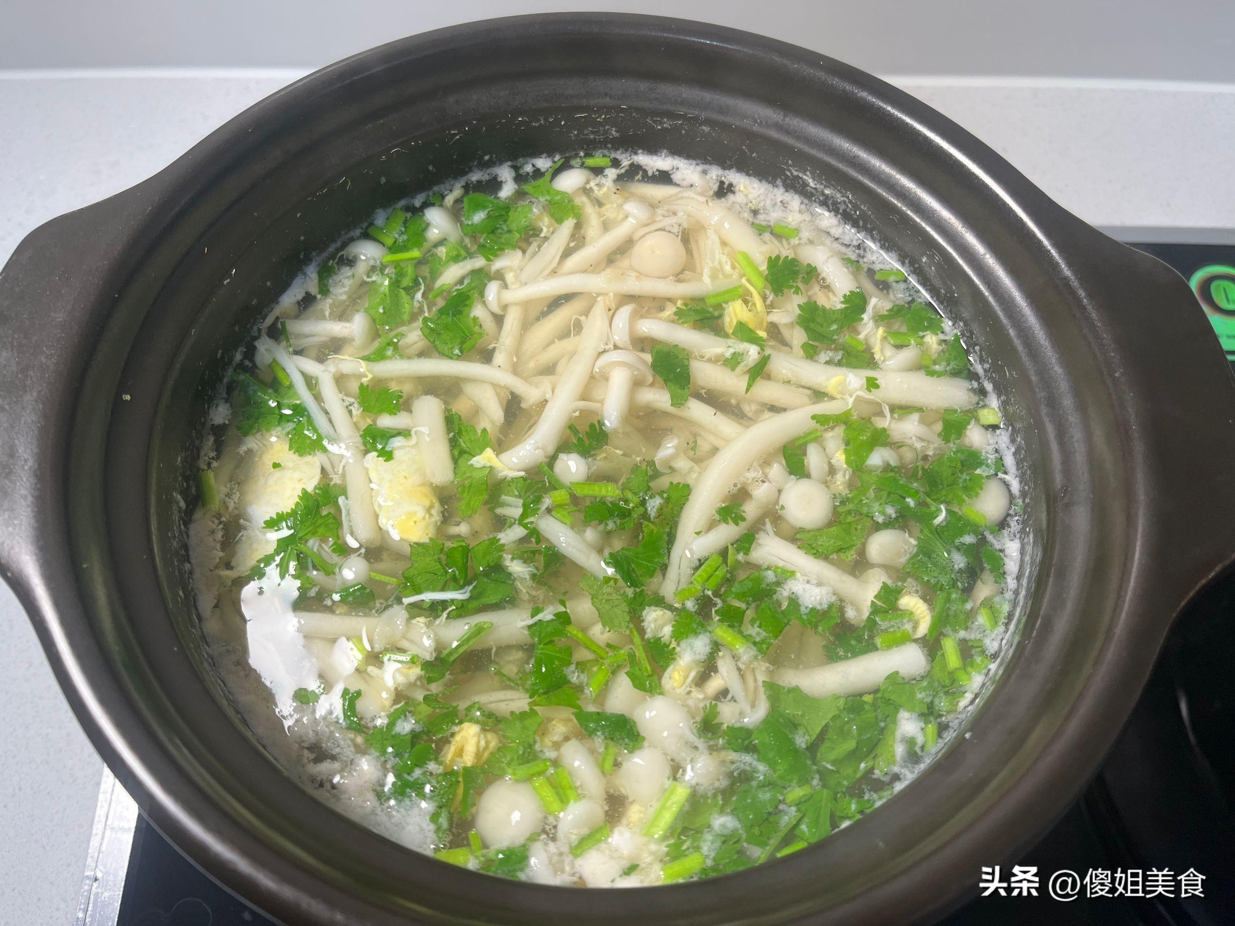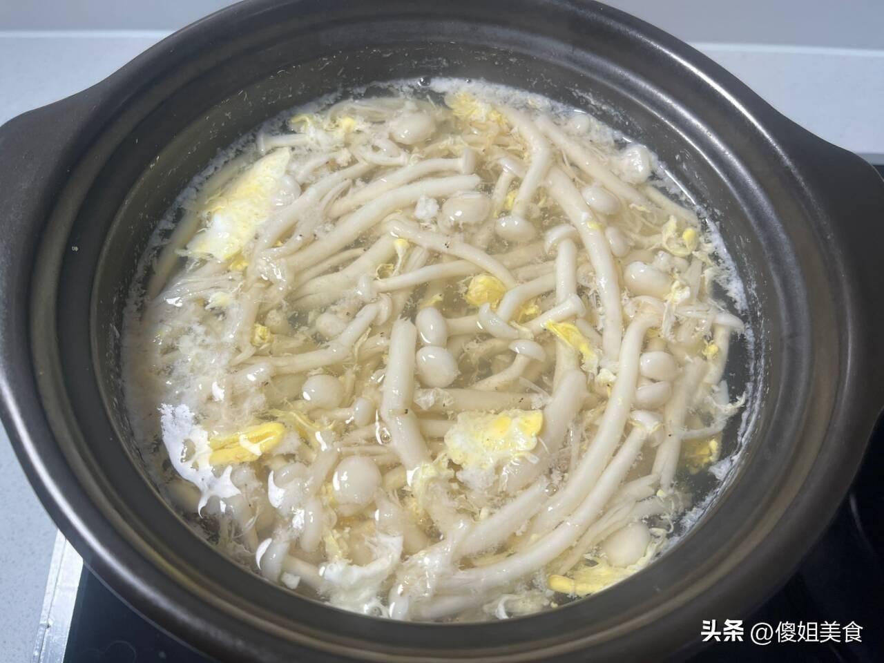 2、 砂鍋內倒入少許食用油,放入蔥花炒出蔥香味,隨後倒入適量水,大火燒開後再放入海鮮菇,大概煮3分鐘左右,(具體時間自己掌握),接着放入一小把幹蝦皮,既營養提鮮又補鈣,最後淋入雞蛋液,加少許鹽、適量味極鮮、香油,攪拌均勻,即可關火盛出。
