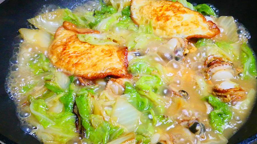 鍋留餘油,下入適量的蔥薑蒜末爆香,接着,下入白菜葉子,大火翻炒至白菜葉子變軟後,倒入適量的清水,再把前煮扇貝出的汁水倒入,水量以剛好沒過食材爲宜。加入生抽、鹽、胡椒粉和少許白糖調味,然後再把煎好的荷包蛋放在上面,蓋好鍋蓋大火燒開後轉小火慢燉。