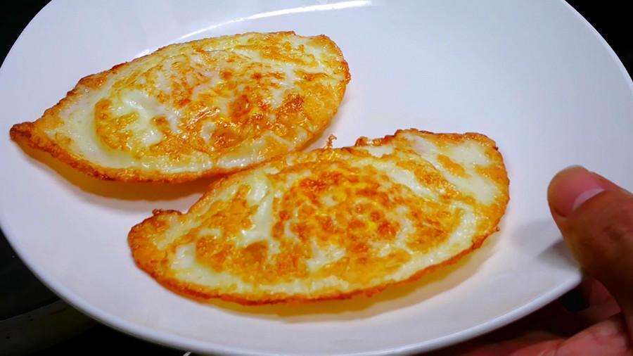 3.熱鍋加油,打入兩個雞蛋,煎成兩面金黃的荷包蛋後盛出備用。(荷包蛋要煎得老一點,這樣會更香!)。