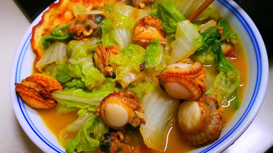 4.大約燉煮15分鐘左右,將白菜燉至軟爛後開鍋,下入之前剝好的扇貝肉,繼續燉2分鐘,燉至湯汁濃稠後關火,加入少許米醋、再撒上一點雞精,攪拌均勻後即可出鍋,美味即成!