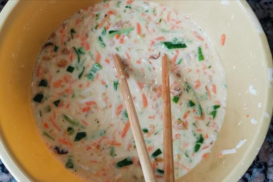 用到:胡蘿蔔、雞蛋、蔥花、鹽、味精、白胡椒粉、麪粉