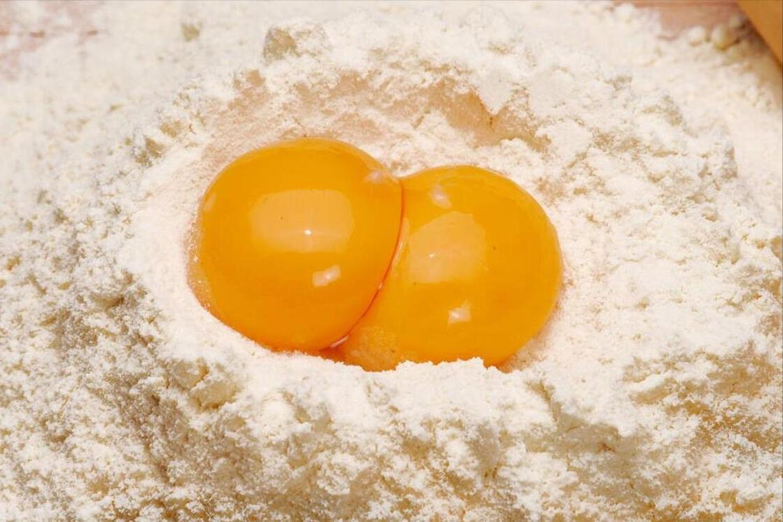 3、但實際上我的做法,是一滴水都用不到的,我們換成它就好——雞蛋。在做手擀麪時,大廚都喜歡用雞蛋來和麪,因爲用它和出來的面可以更勁道、更爽滑,並且還不會粘連、黏糊糊的。