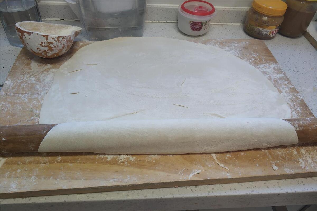 5、隨後將其揉成一個麪糰,揉好之後上面鋪上保鮮膜,放入冰箱內冷藏醒發,1個晚上的時間後取出來,在案板上撒上乾麪粉,然後用擀麪杖來擀麪片,隨後切成條狀的手擀麪,拿起來稍微抻一下就可以啦。