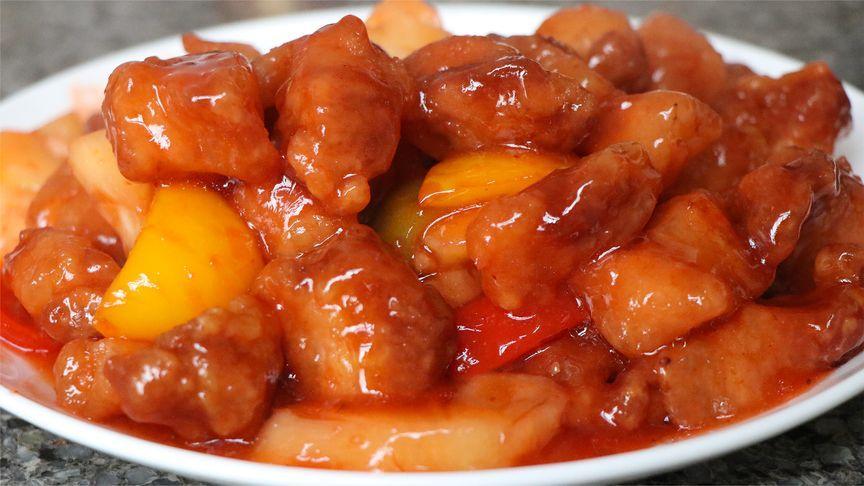 咕嚕肉又稱古老肉,是一道具有悠久歷史的廣東傳統名菜。它以酸甜可口的味道和外酥裏嫩的口感而受到人們的喜愛。選用肥瘦相間的豬肉,將其切成小塊,用鹽、料酒、雞蛋等調料醃製入味,然後裹上一層澱粉放入油鍋中炸至金黃色撈出備用。鍋中留少許底油,放入番茄醬、白糖、醋等調料炒製成酸甜汁,然後將炸好的豬肉塊倒入鍋中,與酸甜汁翻炒均勻,使每一塊豬肉都裹上酸甜汁。最後加入適量的菠蘿塊、青椒塊、紅椒塊等配菜翻炒均勻即可出鍋。咕嚕肉色澤紅亮,酸甜可口,外酥裏嫩。那濃郁的酸甜汁包裹着鮮嫩的豬肉和清甜的菠蘿,口感豐富,讓人食慾大開。無論是大人還是小孩,都對這道美味的咕嚕肉情有獨鍾。