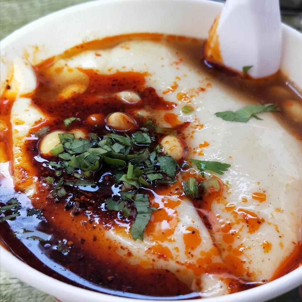 6、把豆腐腦舀出來,盛在碗中,最後加上自己喜歡的調料就可以了,我這裏放了榨菜、香菜、生抽、辣椒油、香油來調味,好喫!