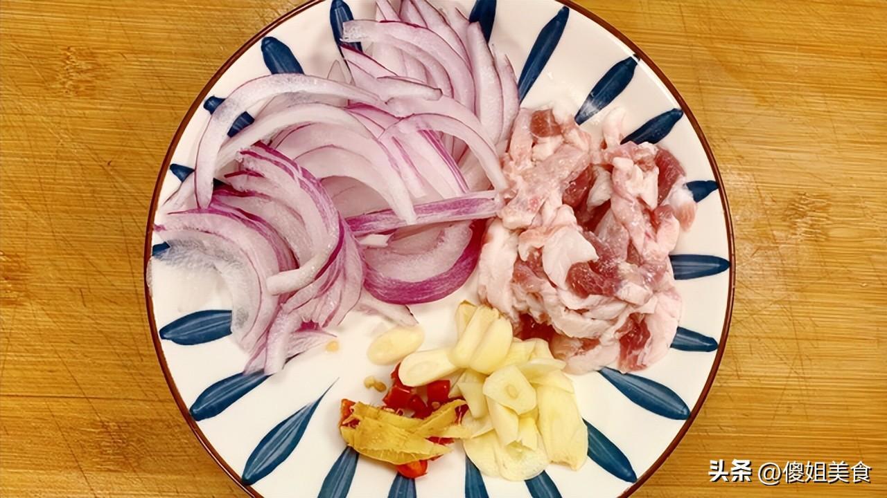 【魔芋炒五花肉】所需食材:魔芋豆腐、五花肉、洋蔥、小米椒、大蒜、醬油、鹽
