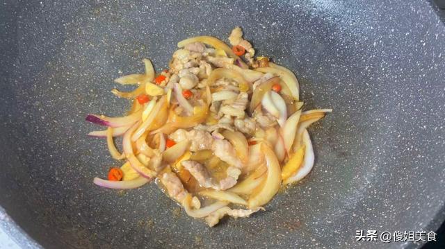 3、鍋中加入少許油,先放入五花肉片,中小火煸炒至出油,變得微微金黃,加入洋蔥絲和大蒜片,繼續翻炒,直到洋蔥變軟,散發香味。