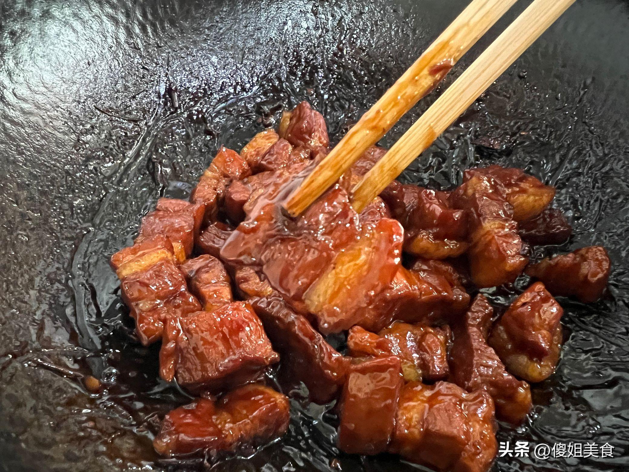 紅燒肉:今天的重頭戲當然是紅燒肉。五花肉切成方塊,鍋裏倒少許油,先把肉塊煸炒出油,再加入薑片、八角、香葉和蔥段爆香。接着加點老抽、生抽和糖,倒入開水,轉小火慢燉。燉煮的過程中,不時地翻動一下,讓每一塊肉都能均勻地吸收湯汁。