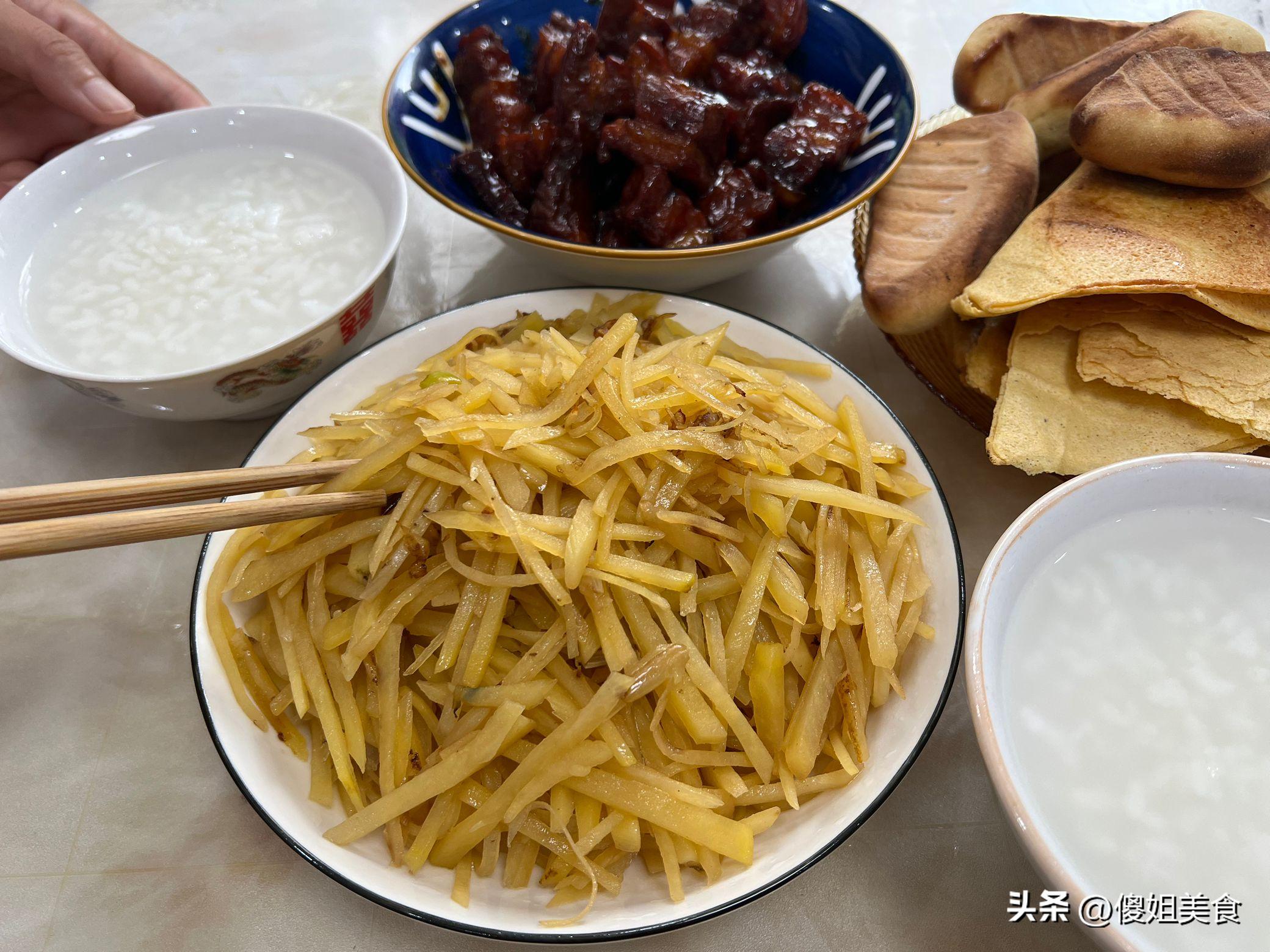 炒土豆絲:這道菜可以說是家常菜中的經典了,幾乎每個家庭都會做。今天買的土豆特別新鮮,洗淨去皮後切成細絲。熱鍋冷油,先下幾瓣蒜炒香,再倒入土豆絲快速翻炒,加少許鹽和醋,繼續翻炒至土豆絲變軟。這樣炒出來的土豆絲口感爽脆,帶着淡淡的蒜香和酸味,非常開胃。老伴每次都誇我炒的土豆絲好喫,說比外面餐館裏的還要香。