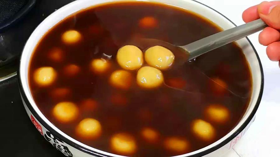 5.起鍋加入適量的清水,燒開後下入做好的小姜丸,像煮餃子一樣將其煮熟,大約需要煮5分鐘左右,中間水沸騰時點入適量的涼水,讓其裏外受熱均勻,煮至小姜丸全部漂浮起來後,再加入適量的紅糖,煮至紅糖化開後繼續燜煮2分鐘,讓紅糖和姜丸的味道互相融合,然後即可關火出鍋。