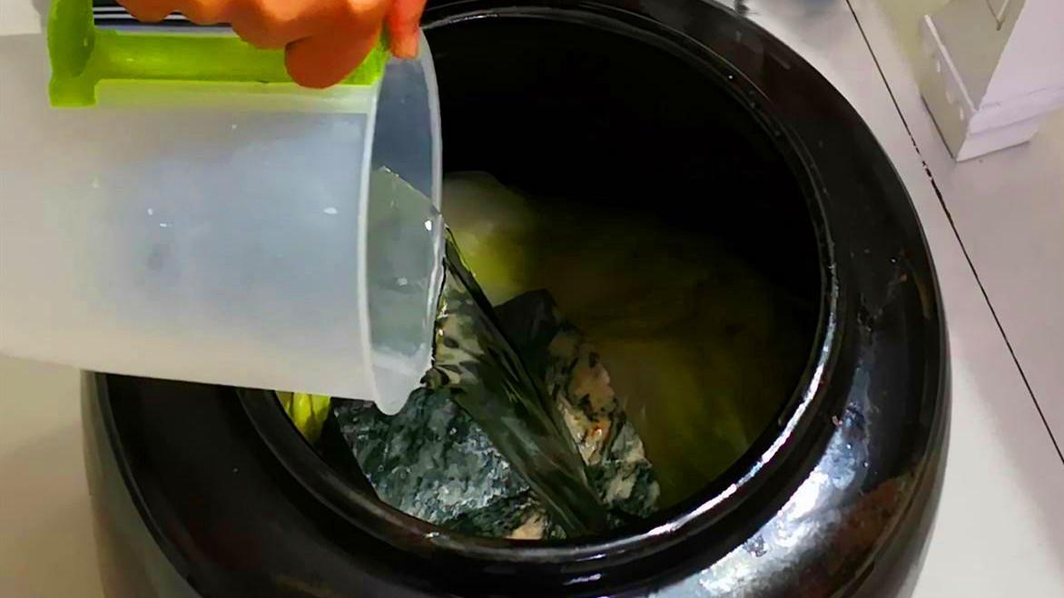 最後找一塊大石頭或是其它的重物,清洗乾淨後壓在白菜上,防止白菜漂浮起來。接着把剛纔燙白菜的水,晾涼後過濾乾淨,倒入缸中,水量蓋過白菜即可。