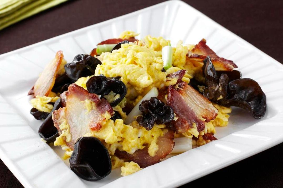 3、鍋內倒油,待其燒熱以後將蛋液倒進去,剛開始不要着急翻動,等到定型以後再來翻動,炒成大塊後盛出來。接下來重新往鍋子裏倒上少許植物油,再次燒熱以後,把木耳倒進去翻炒。