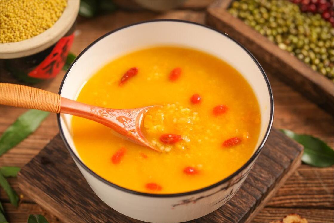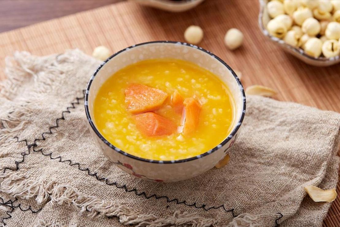 2、趁着煮粥的時間,我們將南瓜洗淨、去皮、挖掉瓤子,切成小塊。等到小米粥煮好了之後,我們再把南瓜倒進去,接着煮上20分鐘左右,直至把南瓜煮爛,最後出鍋之前,撒上幾顆枸杞就可以啦。
