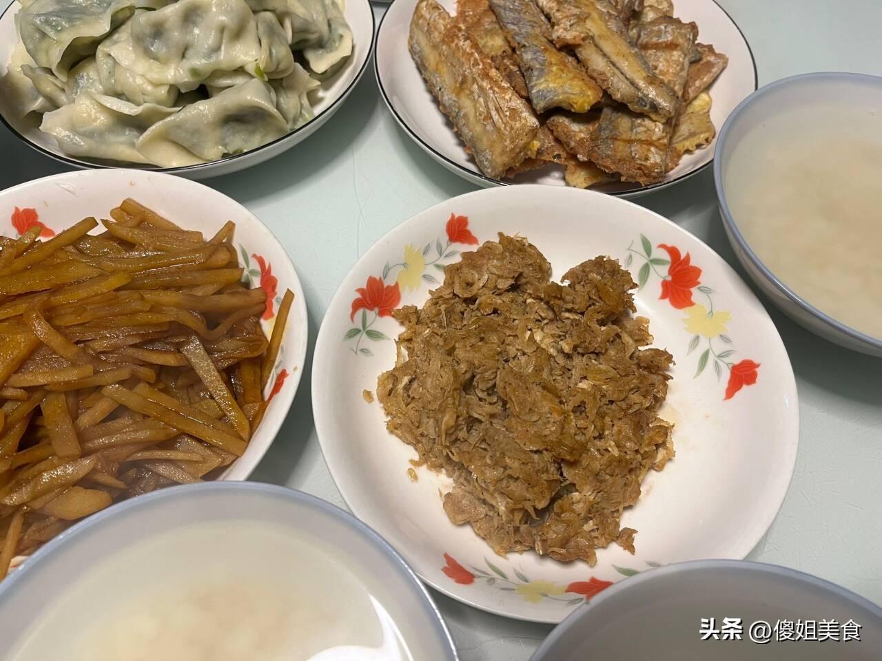 這兩個菜也是剩菜,白天我在上班,中午在廠子裏喫飯,兒子呢在學校喫飯,老兩口中午就簡單的炒兩個菜,老人就是過日子,中午炒的菜不捨得喫,等晚上我們都回來再喫。婆婆中午炒了我愛喫的土豆條,還有一個雞蛋炒蝦皮。晚上不需要喫大魚大肉,簡單的喫點就好了。