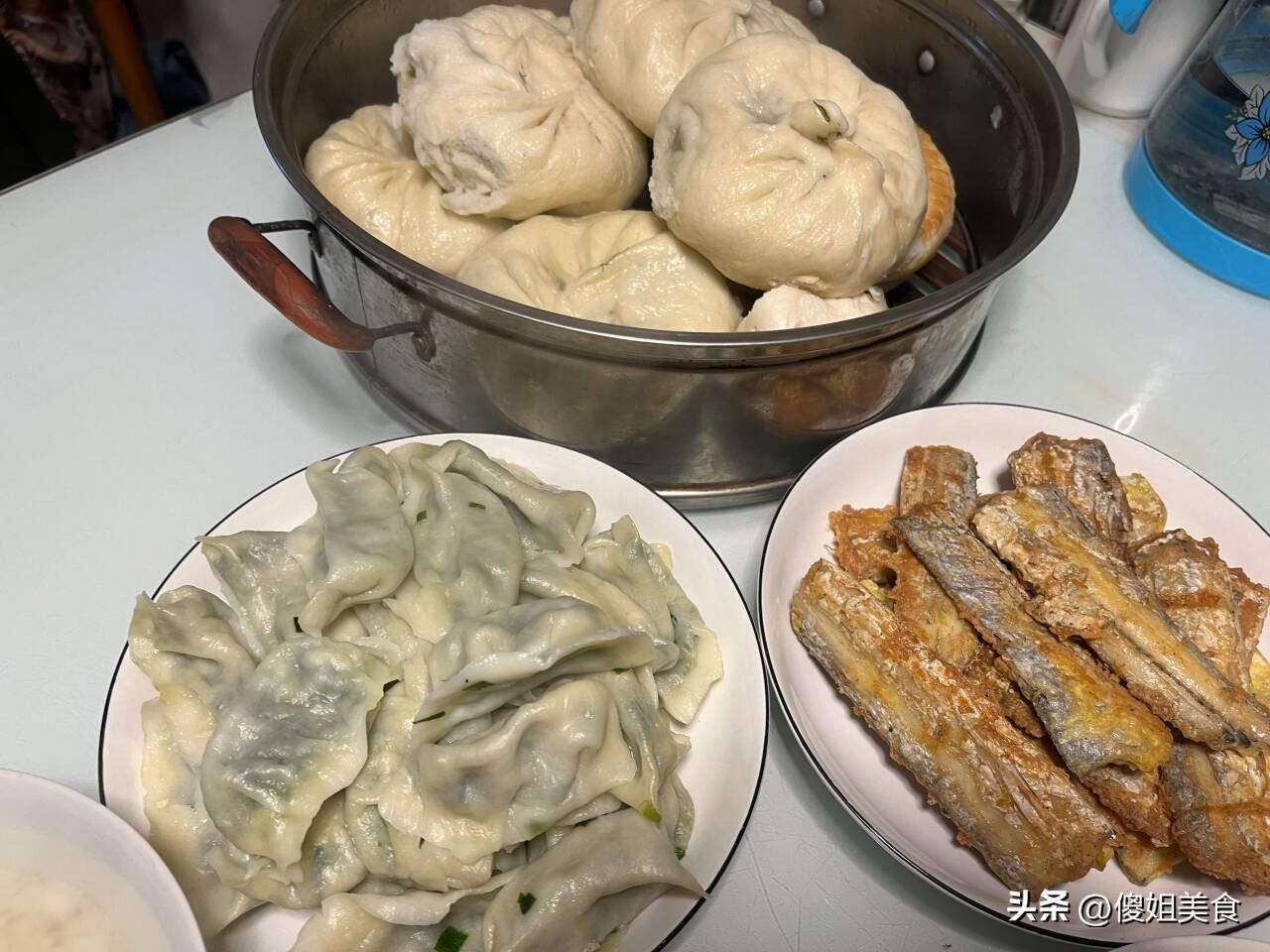 主食我們喫的是餃子和包子,我家兒子比喜歡喫菜餡,婆婆就每天就會換着樣的給兒子做。韭菜餡的餃子,茴香餡的包子,都是前兩天喫剩下的。公婆年齡大了,晚上一般都不喫主食,就我和兒子兩個工人人喫。兒子喫了剩下的一盤韭菜素餡餃子,我喫了一個茴香肉餡的大包子。大包子真好喫,有滋有味的,比我平時自己蒸的包子好喫多了。