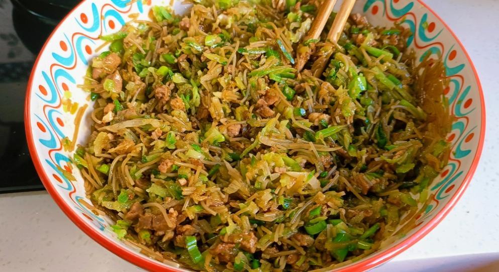 6.然後把豬肉丁、蝦皮和粉條全都放到蘿蔔餡中,再加入適量蔥花、薑末、然後加入適量的食用油、食鹽、生抽、蠔油、花椒粉和雞精,攪拌均勻後即可,好喫的蘿蔔包子餡就調好了。