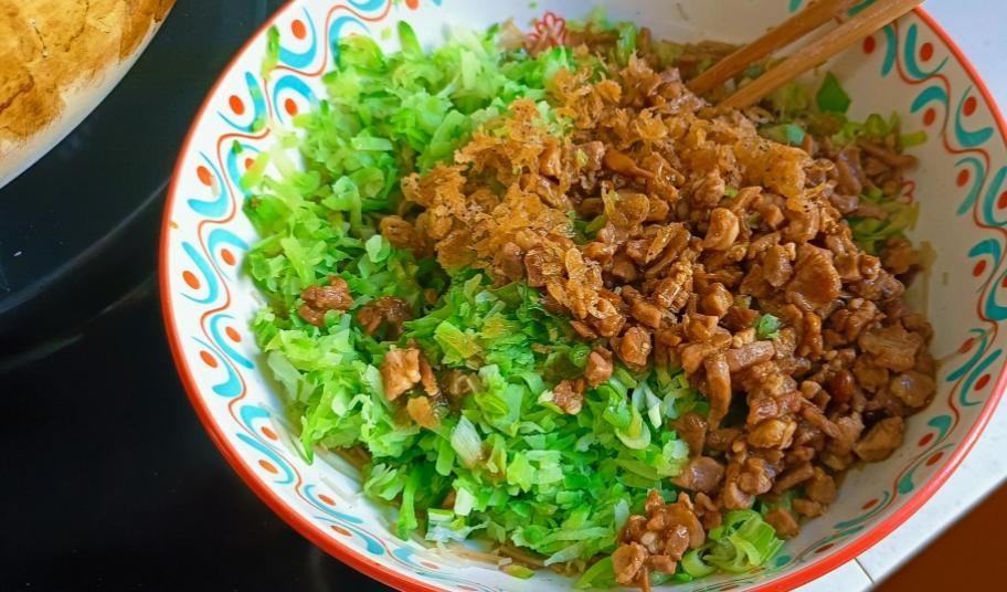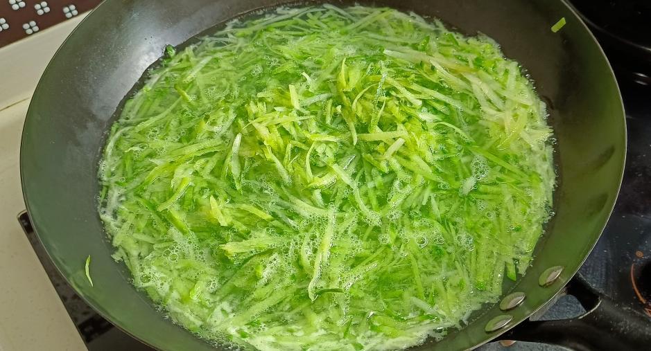 2.然後準備兩根青蘿蔔,洗淨後用擦菜板擦成蘿蔔絲,放入開水中焯燙一會兒,去除蘿蔔的異味,撈出後過涼水,擠乾淨水分後剁細,放入盆中備用。
