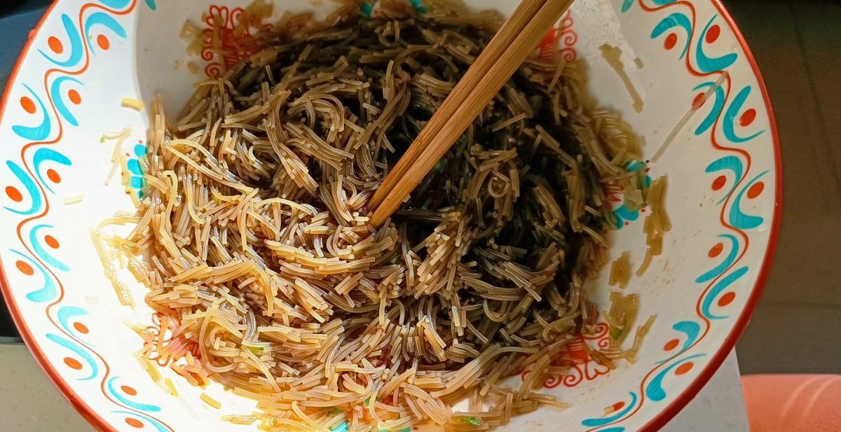 3.粉條一把放到焯蘿蔔絲的熱水中泡軟,然後切成小段放入碗中,加入適量的生抽、食用油和少許老抽,攪拌均勻後備用。