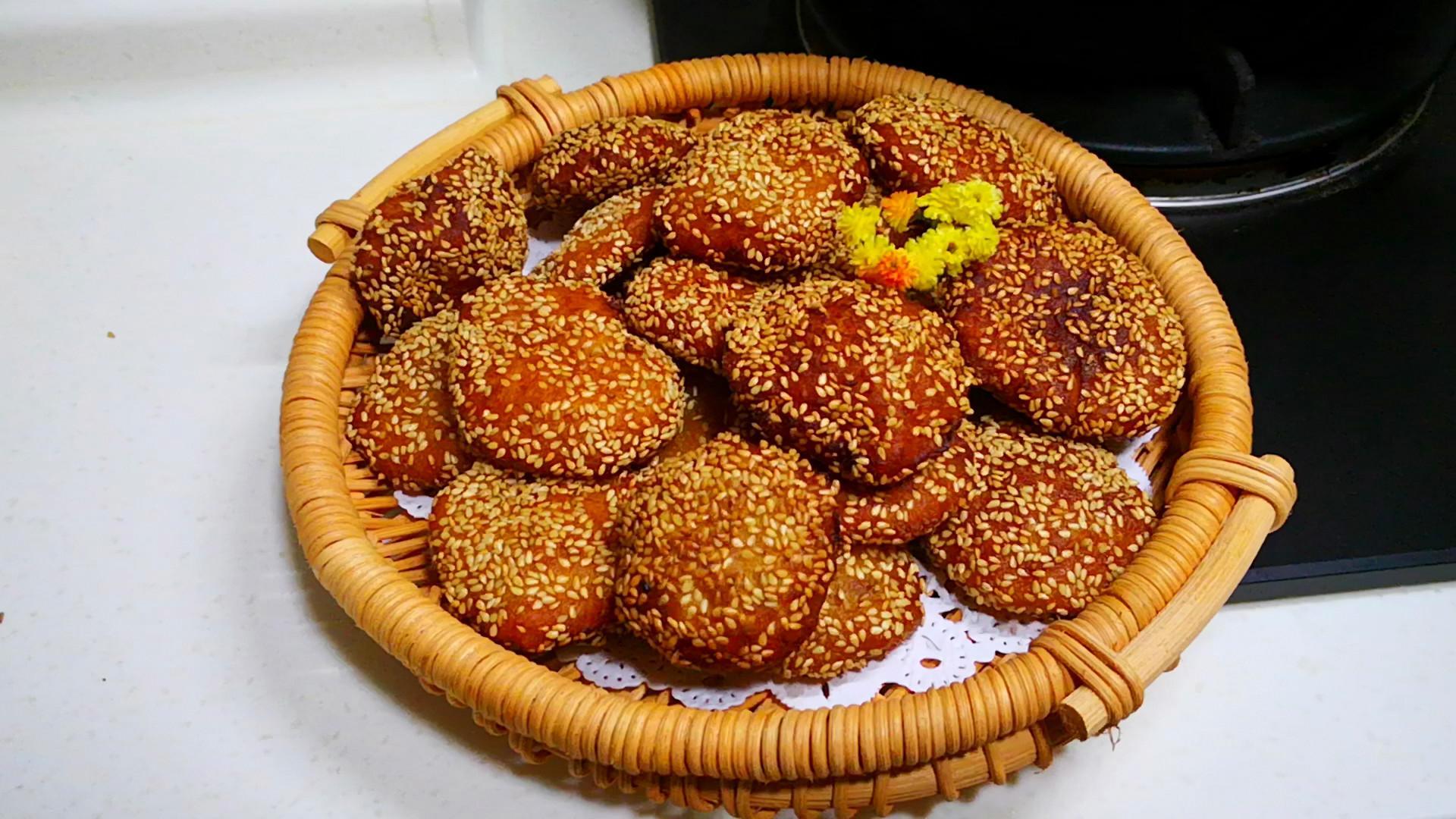 紅薯洗淨後去皮,然後切成薄片擺入盤中,再放到蒸鍋裏,大火燒開後再蒸15分鐘左右,將紅薯片蒸熟蒸爛;蒸好的紅薯用勺子按壓成紅薯泥,再加入兩勺白糖、兩勺蜂蜜,攪拌均勻後再分少量多次加入糯米粉,攪拌至絮狀無干面時,下手揉成麪糰,再揪下一小塊,兩手搓成小球,再用手掌將其按扁,然後放到裝白芝麻的盤子裏,正反兩面均勻地粘上一層白芝麻;起鍋加油,油要多加得稍微多一點,油溫5~6成熱的時候下入紅薯餅,用筷子輕輕翻動紅薯餅慢慢煎炸,使其受熱均勻,炸至紅薯餅外皮變金黃,並且個個鼓起大泡的時候,紅薯餅就熟了,控油撈出裝盤即可。