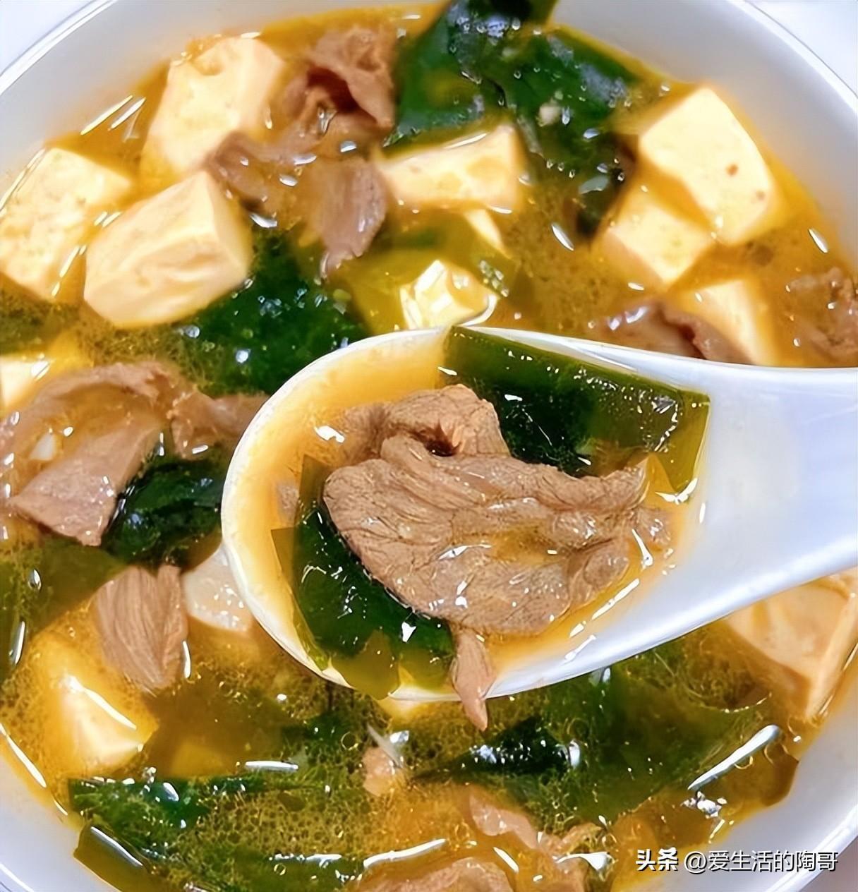 裙帶菜營養豐富,嫩豆腐口感好。肉片用牛肉片,作爲優質蛋白質的來源,也是補充能量和營養的良好選擇。
