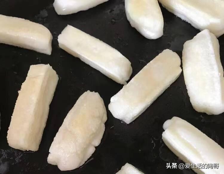 3鍋裏燒油,油7成熱,依次放進糯米條,來炸,小火慢炸,炸至兩面金黃控油即可