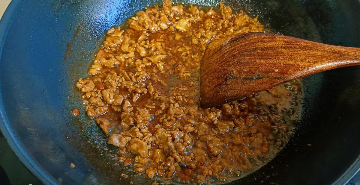 2.取適量的豬肘肉剁成肉餡,然後起鍋加油,下入肉餡翻炒,炒至肉餡中的油脂,炒至肉餡變色後加入一勺黃豆醬和適量的生抽,繼續翻炒至肉餡均勻裹滿醬汁後關火,盛入大碗中備用。