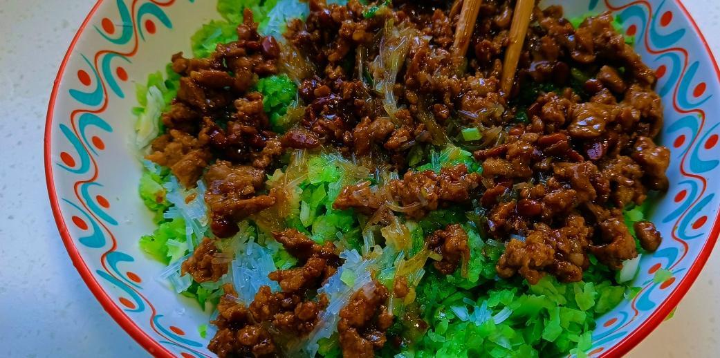 5.最後,將切碎的蘿蔔和豬肉餡、蝦皮、粉絲全都放到一起,再加入適量的蔥花、薑末,然後加入兩勺食用油,攪拌均勻後再加入少許食鹽、適量花椒粉、胡椒粉、雞精調味,用筷子充分將餡料攪拌均勻即可,鮮美好喫的蘿蔔肉餃子餡就調好了,真香啊!