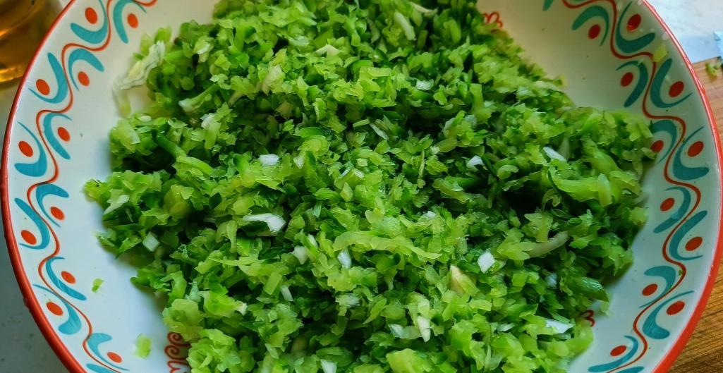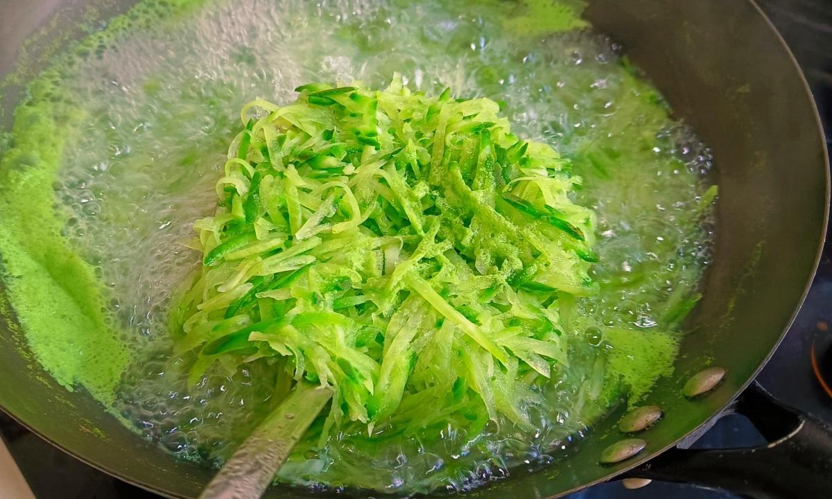 1.先準備一根新鮮的青蘿蔔清洗乾淨,切去根部以後,再用擦菜板擦成絲,然後燒一鍋開水,水開後先加一點鹽,然後下入蘿蔔絲焯燙一會兒,去除蘿蔔的異味,水再次沸騰後繼續焯水一兩分鐘,焯至蘿蔔絲變翠綠色後撈出,放到涼水中過涼,再撈出用力擠幹水分後剁細備用。