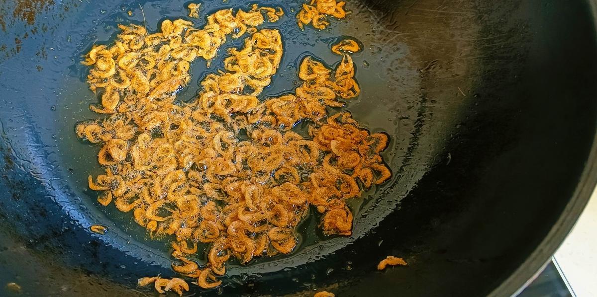3.再取一把蝦皮下入鍋中,煎炒至蝦皮微微變黃、出香味後盛出備用。