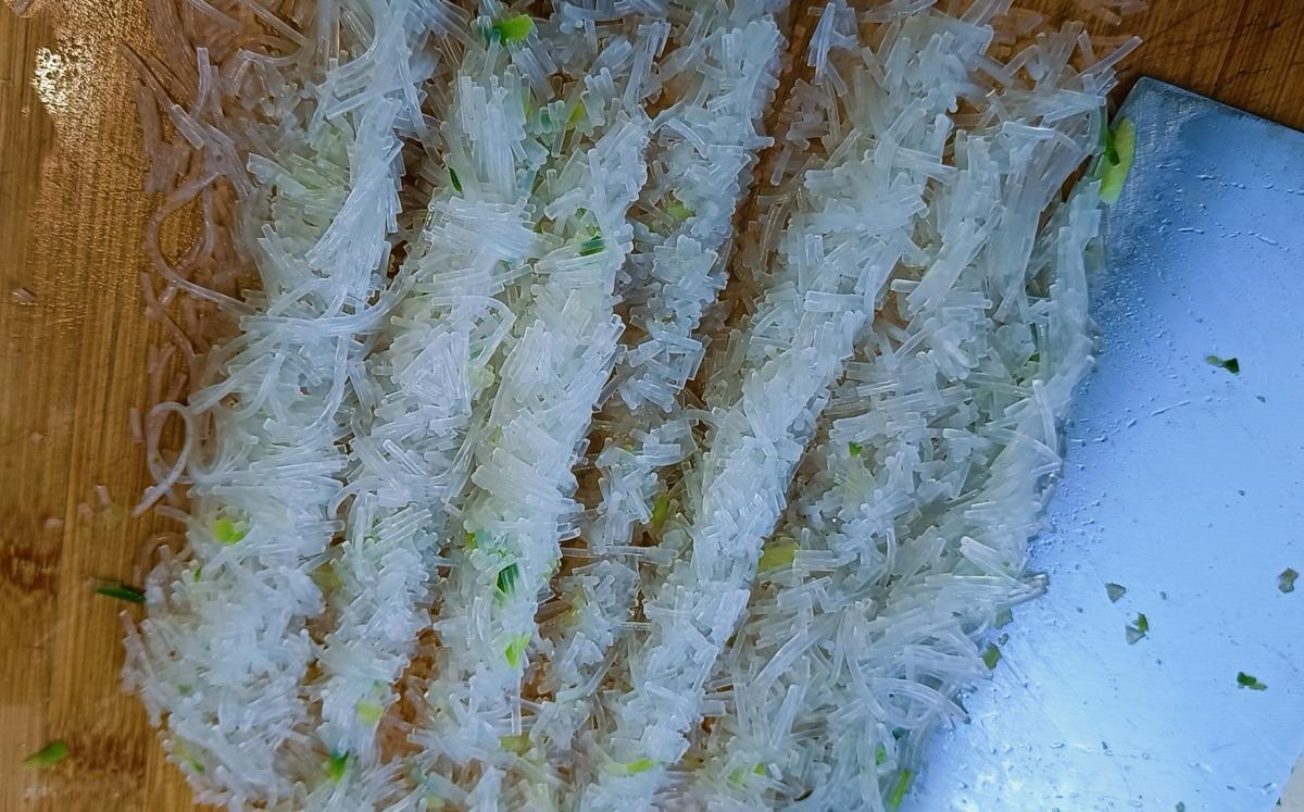 4.再取一把粉絲放到焯蘿蔔絲的熱水中泡軟,然後撈出放到案板上切碎剁細備用。