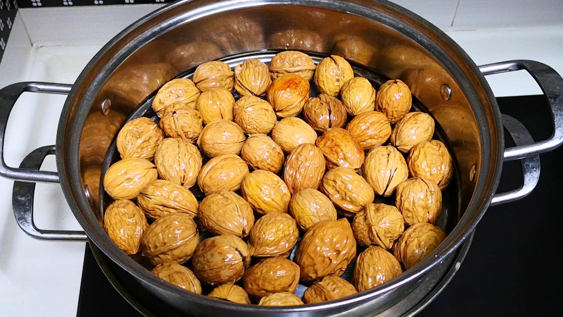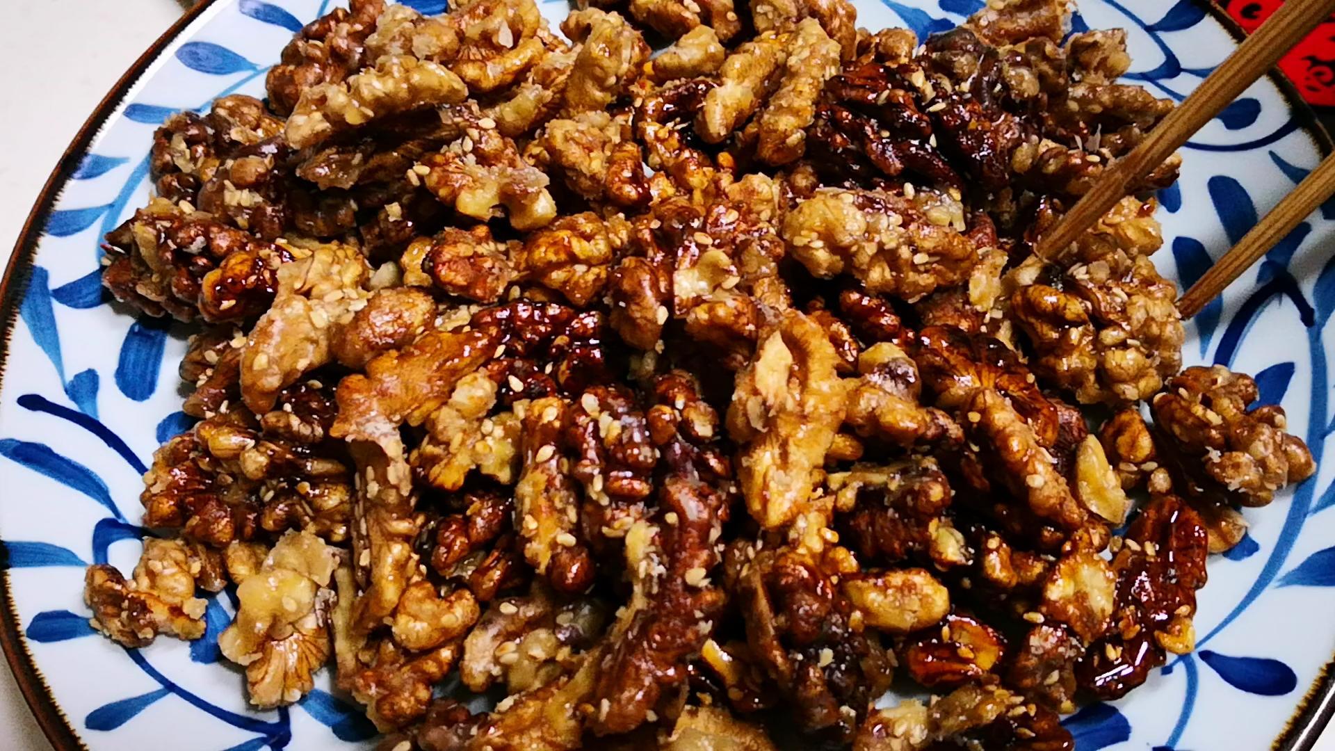 【琥珀核桃】先剝核桃仁,然後起鍋加入大約100克白糖,同時加入等量的清水,水和糖的比例爲1:1,先開大火把它燒開,然後轉小火,並且用鏟子不斷地推動,防止糊鍋,直到由大泡變成密集的小泡,並且推着有阻力,這時倒入剝好的核桃仁。這時候糖漿基本爲琥珀色,仍然要不停地翻動,使每個核桃仁都均勻地裹上糖漿,然後撒上一把芝麻,翻拌均勻後關火出鍋。