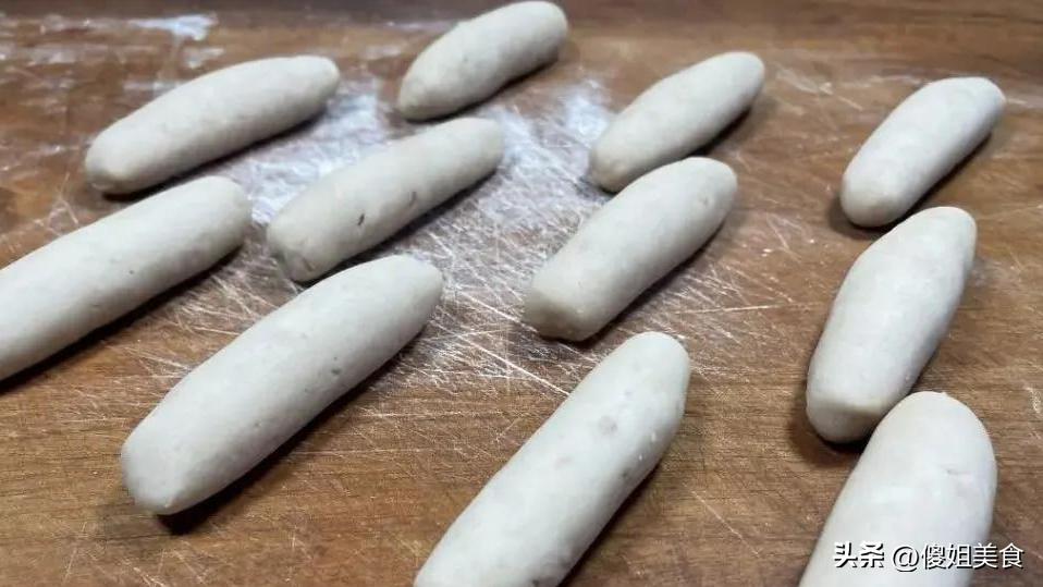 3、案板上撒一層薄薄的木薯澱粉,揪一小塊麪糰雙手搓成橢圓形的芋圓,一個個的依次做好放置一邊兒備用。4、鍋中加足量的清水,水開後把做好的芋圓一個個地下入鍋中,用鏟子輕輕地鏟動,以防粘連到一起,大火燒開煮2分鐘以後即可撈出。