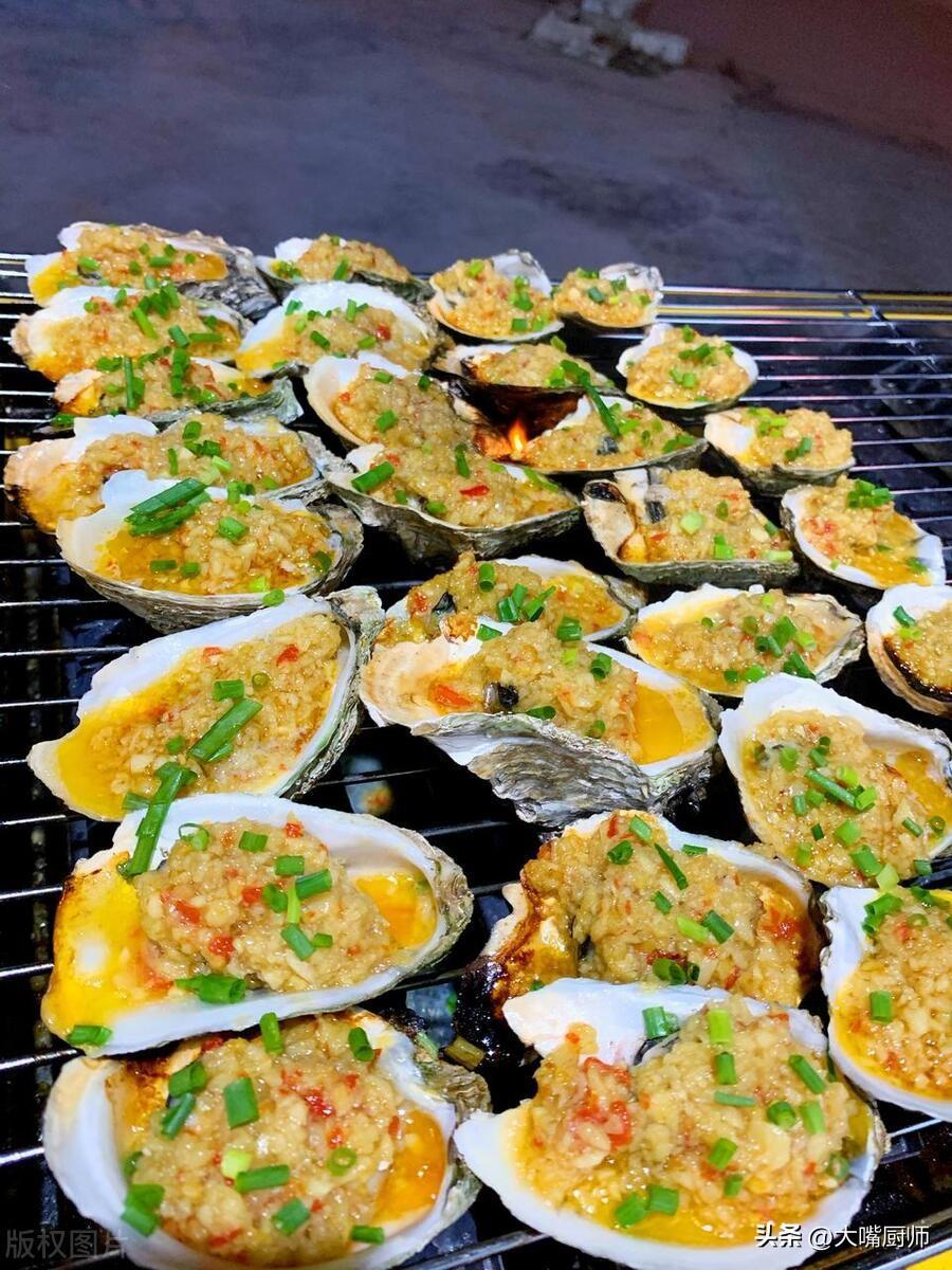 - 在生蠔肉上放上蒜蓉、辣椒末、蔥花等調料,放在炭火上烤制。