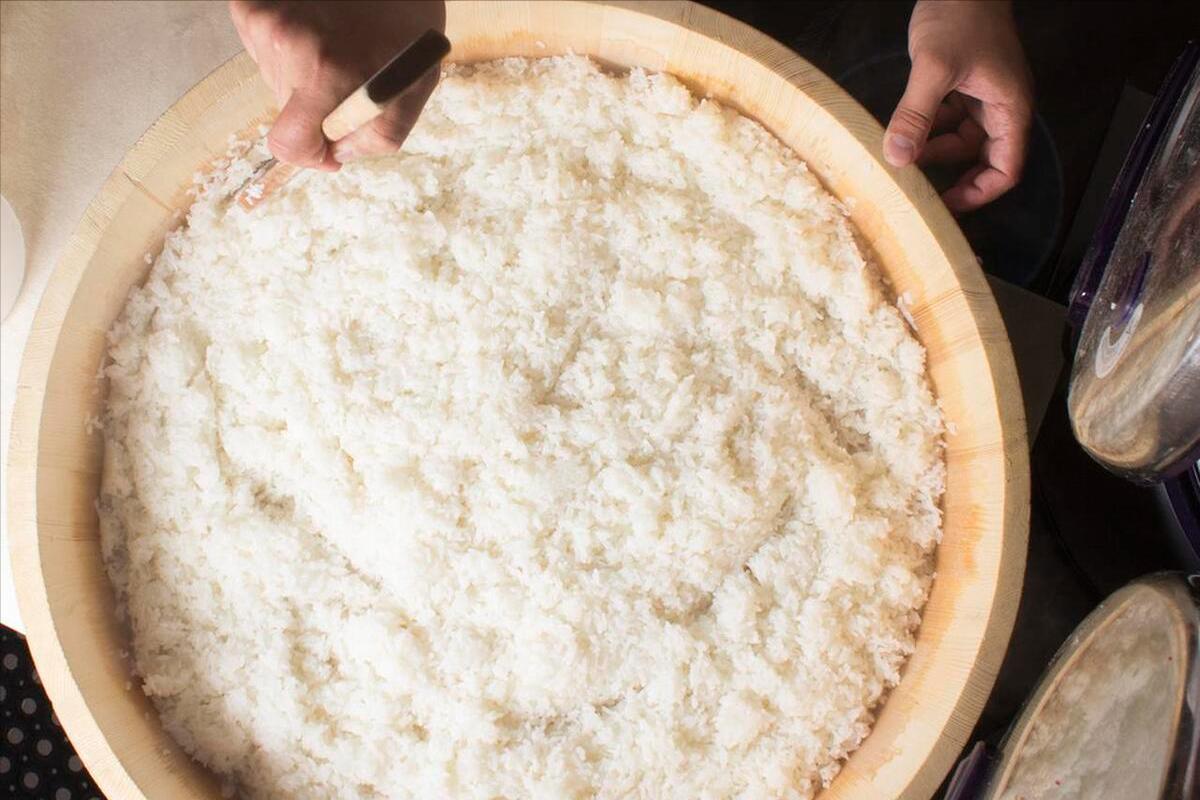 4、往蒸好的糯米中,倒入250g左右的涼開水,充分攪拌均勻,然後再用溫度測量一下溫度,等到糯米晾涼到36度左右,和人體相似的溫度後,再來撒酒麴,這樣出酒量會更高的,這就是“多做1步”。