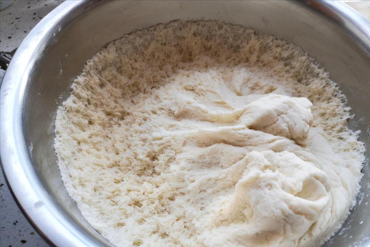 3、在醒發麪團時,務必要保證在暖和的環境中,醒發至少1個小時的時間,醒發到什麼程度呢?撕開面團看一下,裏面是蜂窩狀,並且體積是之前的2倍大,就說明可以了,如果沒達到這個程度的話,還需要再醒發一陣兒,發酵至蜂窩狀,這是第1個要點。