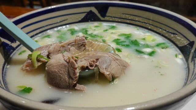 3、燉煮好的羊肉湯呈乳白色,香氣濃郁,喝上一碗,全身暖洋洋的。