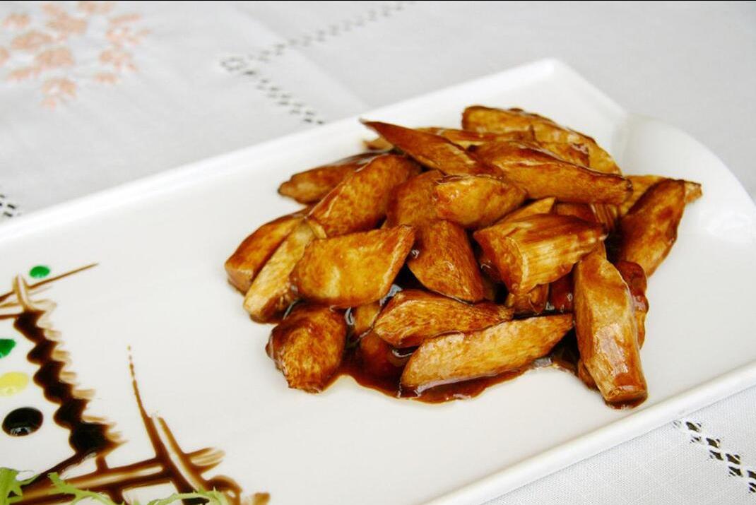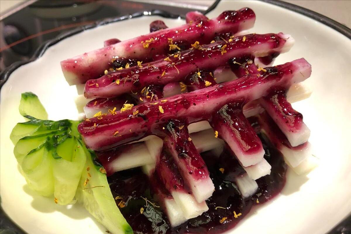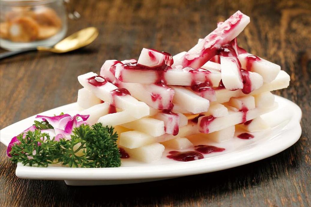 山藥洗淨後,把外皮削掉,然後切成小段放在鍋中蒸一下,蒸熟了之後就可以取出來啦。將山藥捻碎以後,用裱花袋擠出來,整理成漂亮的形狀,隨後將藍莓醬和清水混合,攪拌均勻後澆在山藥泥上,開喫,酸酸甜甜。