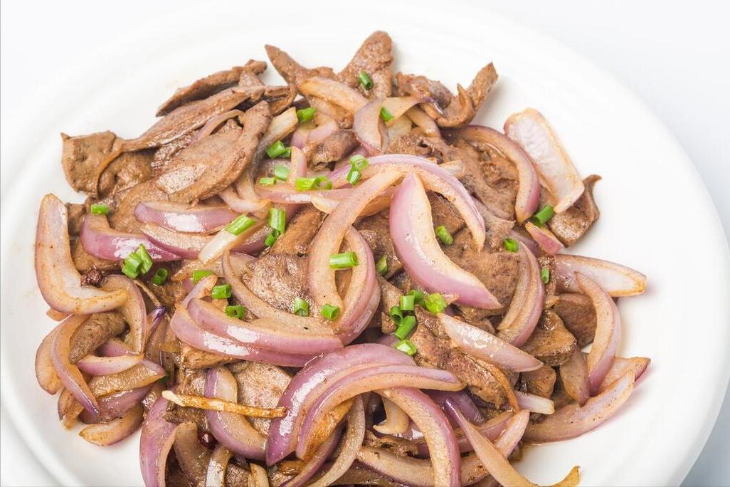 2、青紅辣椒、蔥薑蒜、洋蔥全部切好,接下來準備好鍋子,燒熱後倒油,下入豬肝滑炒,炒到變色後盛出來,然後將青紅辣椒、蔥薑蒜、洋蔥倒進去爆香,接着倒入豬肝,用料酒、鹽、雞精、生抽、老抽進行調味,出鍋開喫。