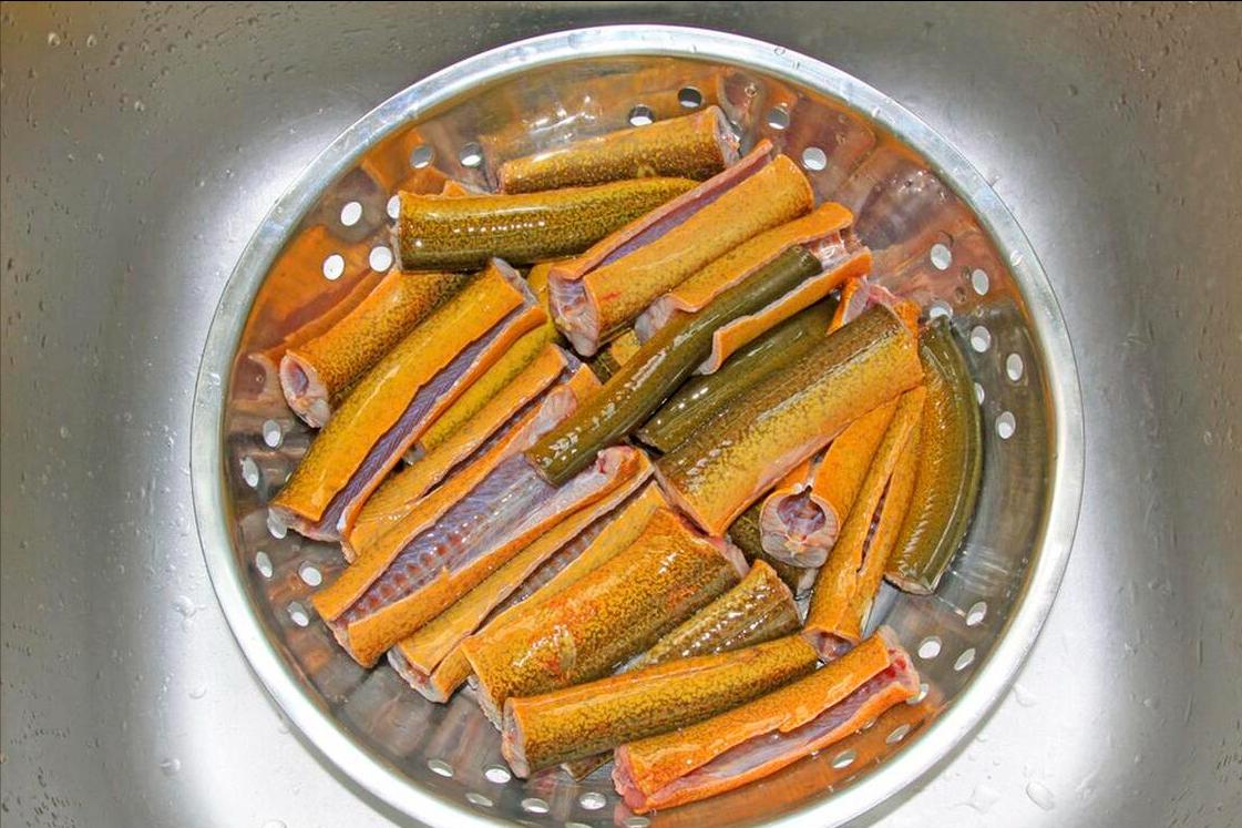 1、首先把黃鱔準備好,買的時候最好讓老闆給你處理乾淨,然後切成小段,買來以後再多衝洗幾遍,控幹水分。