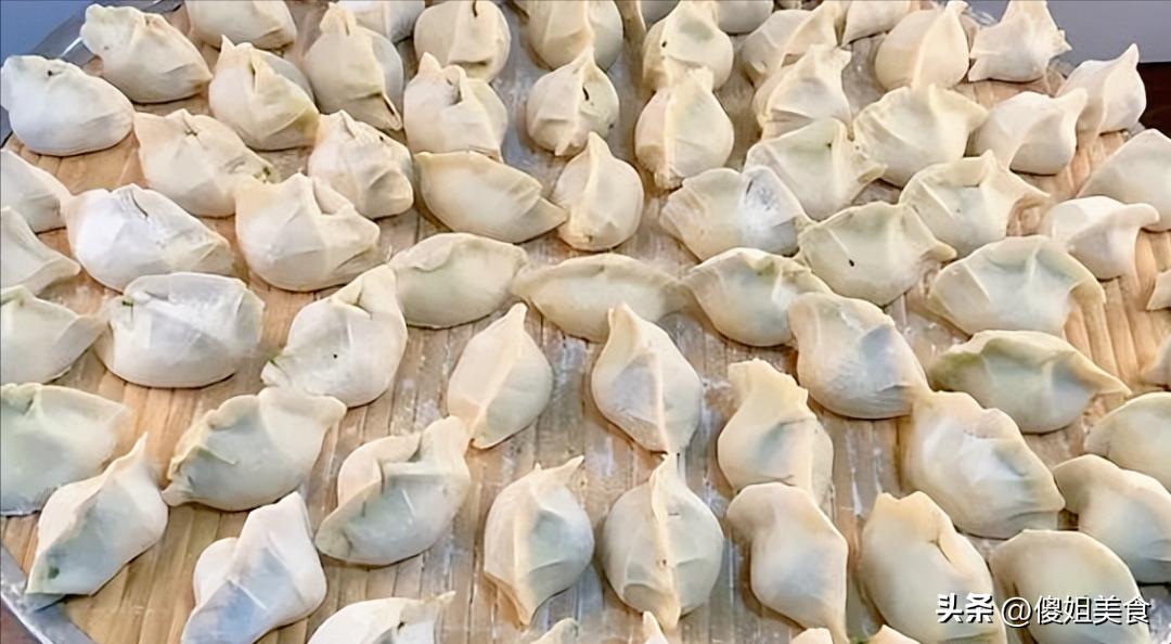 3、將麪糰揉光滑,搓成長條,切成劑子,擀成餃子皮。5、餃子皮上放上適量餡料,捏住中間,兩手虎口處壓住餃子皮,兩邊使勁一捏,包好的餃子放在蓋簾上。