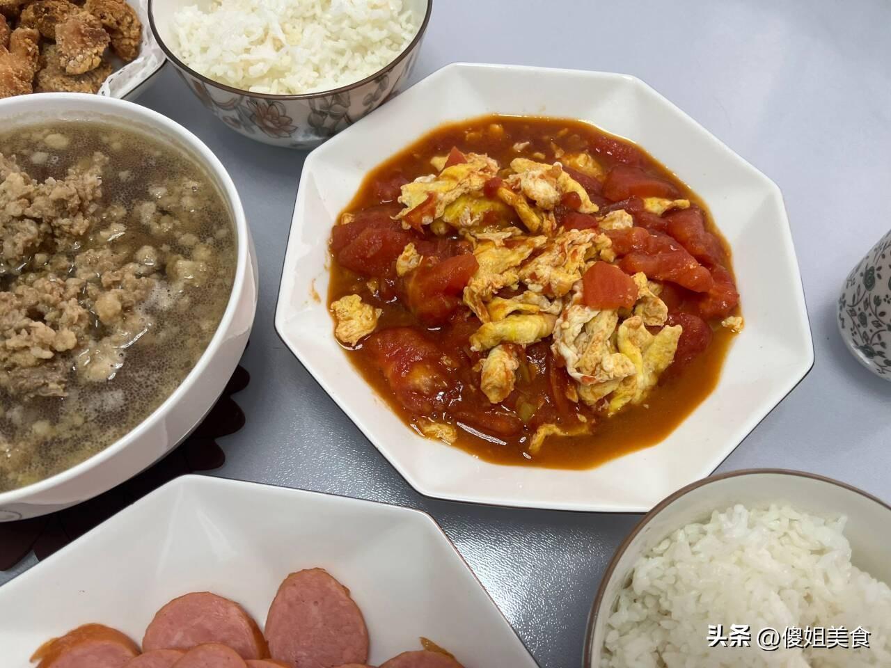 弟媳婦還炒了西紅柿雞蛋,這道菜也是她的拿手菜,更拌米飯最好喫的菜,每次來孩子們就會讓舅媽做西紅柿炒雞蛋。我在一旁看着弟媳婦炒菜,也搭不上手,弟媳婦炒西紅柿都是把皮用開水燙一下撕下來,再切成塊炒,下鍋的時候放點白糖,這樣做的柿子酸甜口味,比我炒的好喫多了,和米飯拌一拌超好喫。