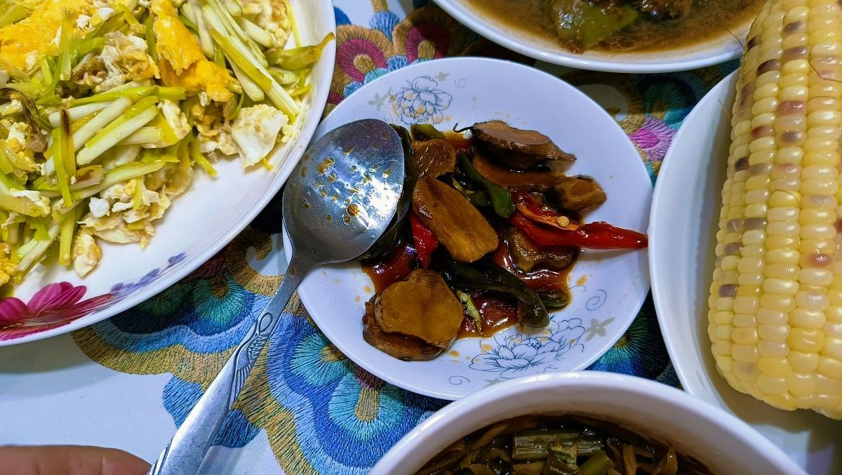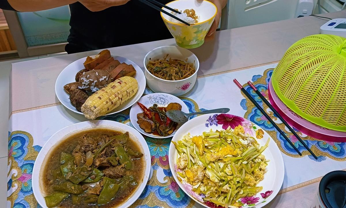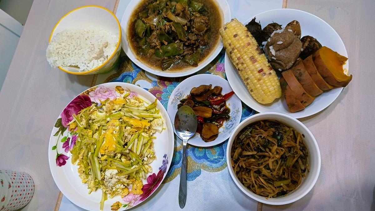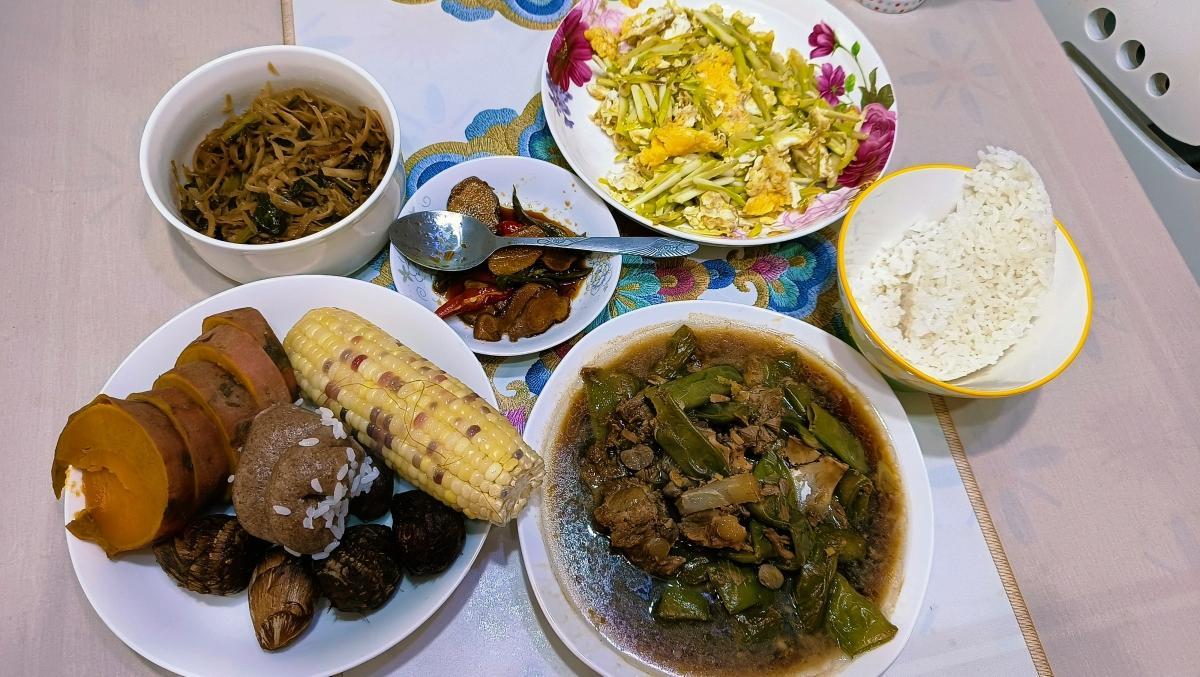主食很豐富,我一鍋蒸了玉米、紅薯、芋頭,還有一個我自己蒸的小小的全麥饅頭,現在上了年紀,飲食也不得不講究一點,所以主食基本都是粗糧,老公喫的米飯是早餐喫剩下的。