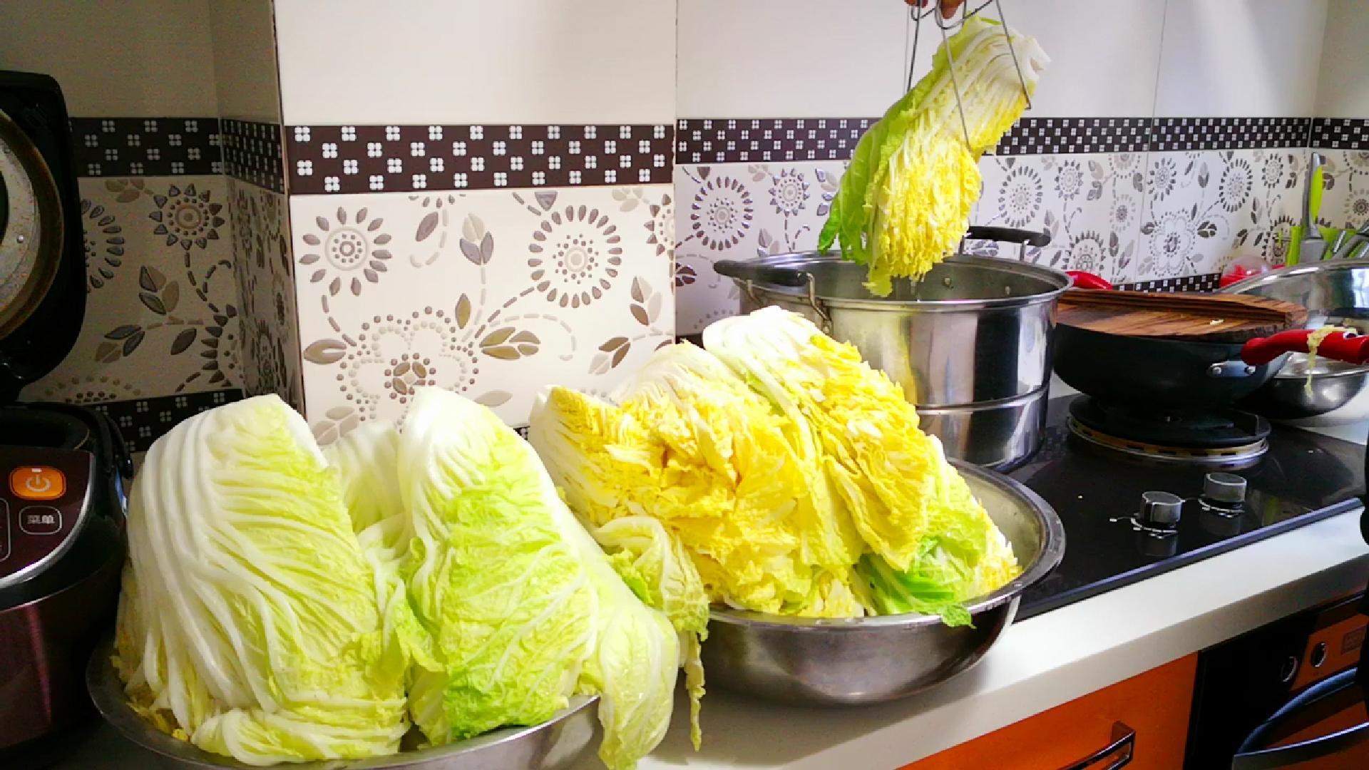 晾曬大白菜:晾曬白菜在選擇白菜上有着嚴格的要求,要求大白菜要葉梗肥厚的,這樣出菜率才高,起鍋加水,水中加鹽增加底味,加鹼面目的是白菜晾過後口感更佳,大白菜整顆焯水2分鐘後過涼開水;充分地擠幹水分後,掛曬在太陽底下,直至成爲白菜乾,注意晾曬的過程要不斷地翻動以免長毛壞掉,碰到天氣不好可以放入烤箱內烘烤。