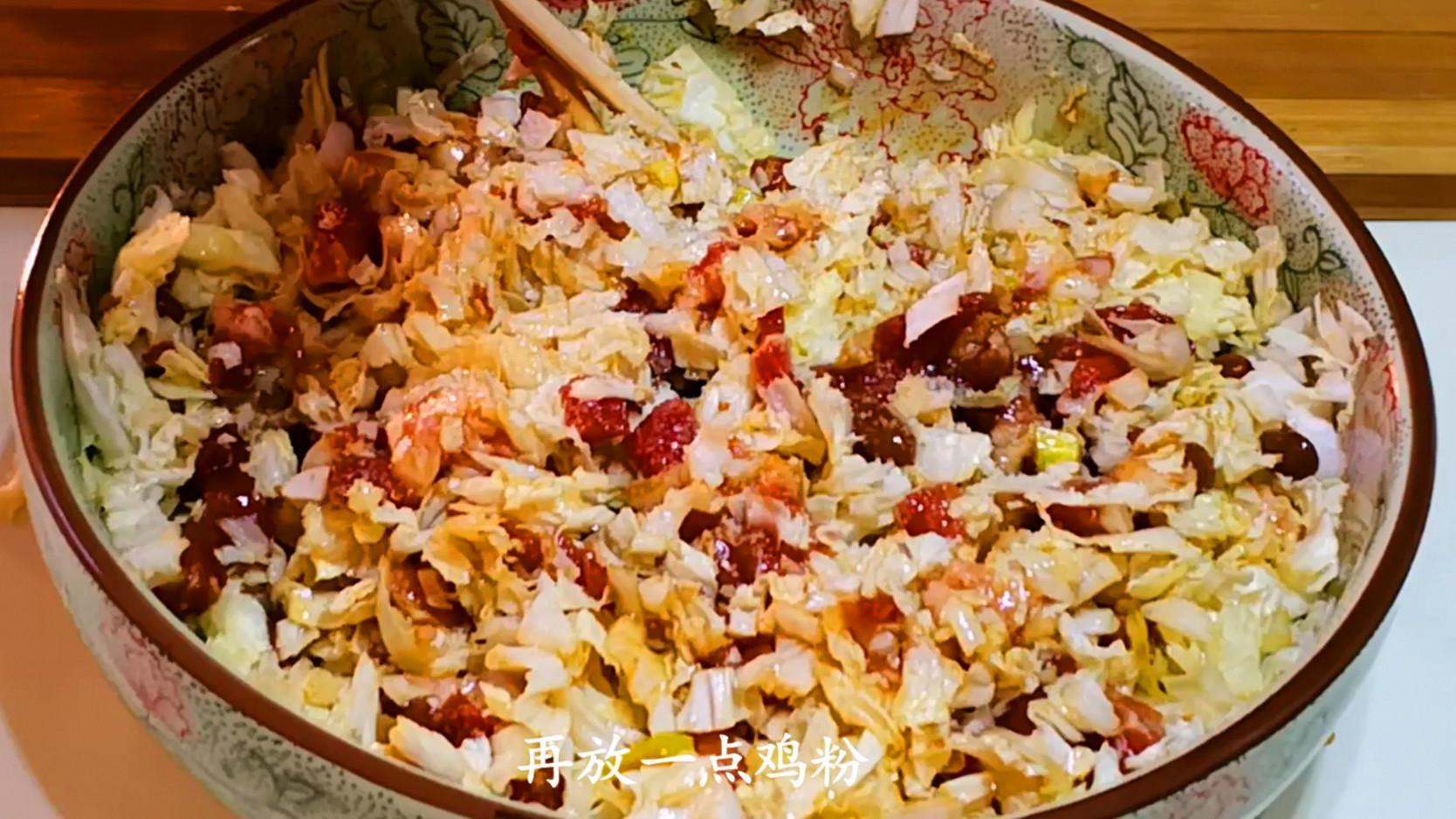 3.接着再準備新鮮嫩綠的白菜葉子,清洗乾淨後切碎剁細,蒸包子的餡倒也用太細,差不多就可以了。因爲白菜在調餡的過程中很容易出水,所以將白菜餡放到盆裏後,再撒上一點鹽,攪拌均勻後靜置一段時間,再擠出裏面多餘的水分後備用。