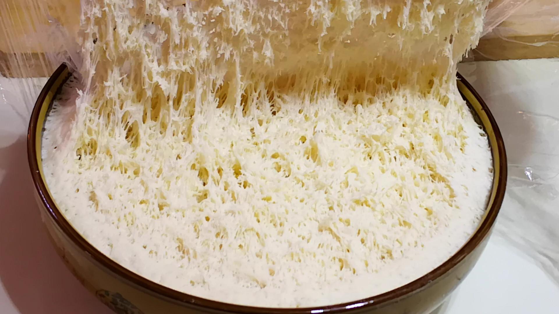 5.待麪糰發酵至約兩倍大,且內部出現蜂窩狀結構時,麪糰就發好了,取出麪糰放到案板上揉一揉排氣後,再將其分成大小均勻的小面劑,按扁後擀成中間厚邊緣薄的麪皮。