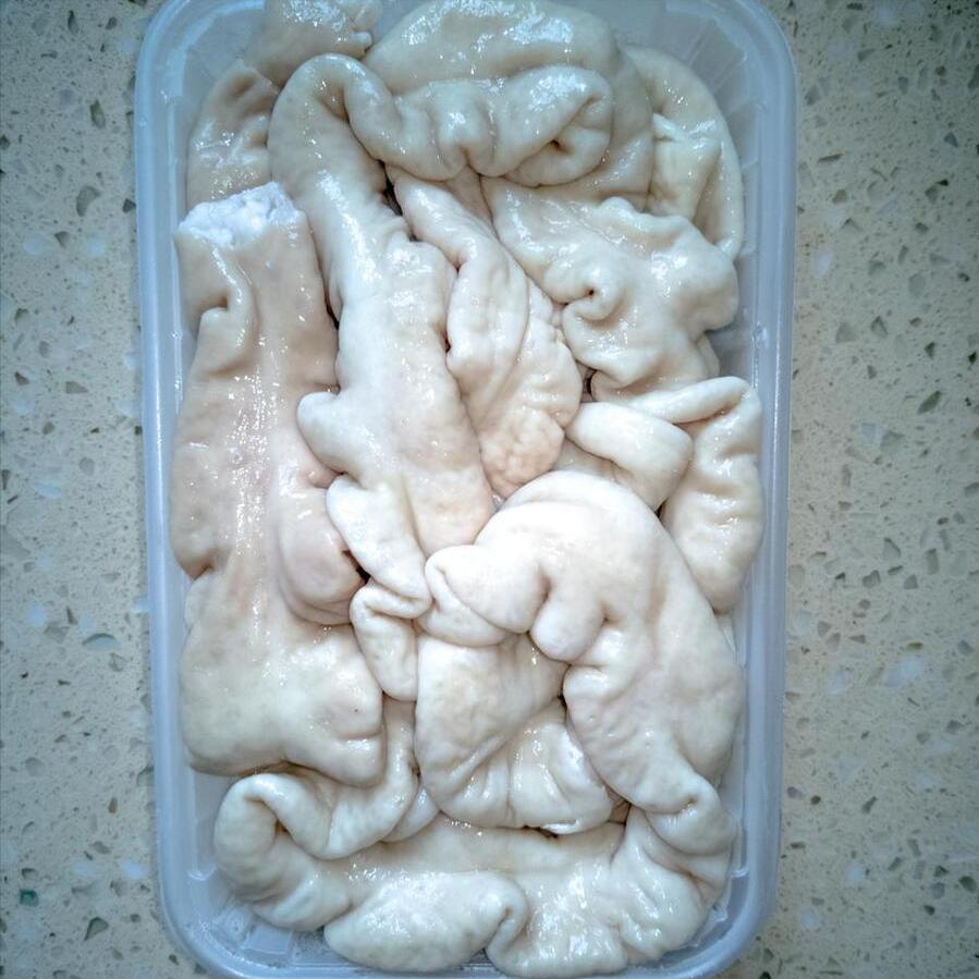 3、清洗豬大腸,不用鹽不用鹼不用醋不用料酒,換成麪粉來操作,效果會更好。爲什麼要用麪粉,很多人不理解,實際上是因爲麪粉吸附能力強,在清洗的過程中,可以帶走豬大腸上面大多數的髒東西。