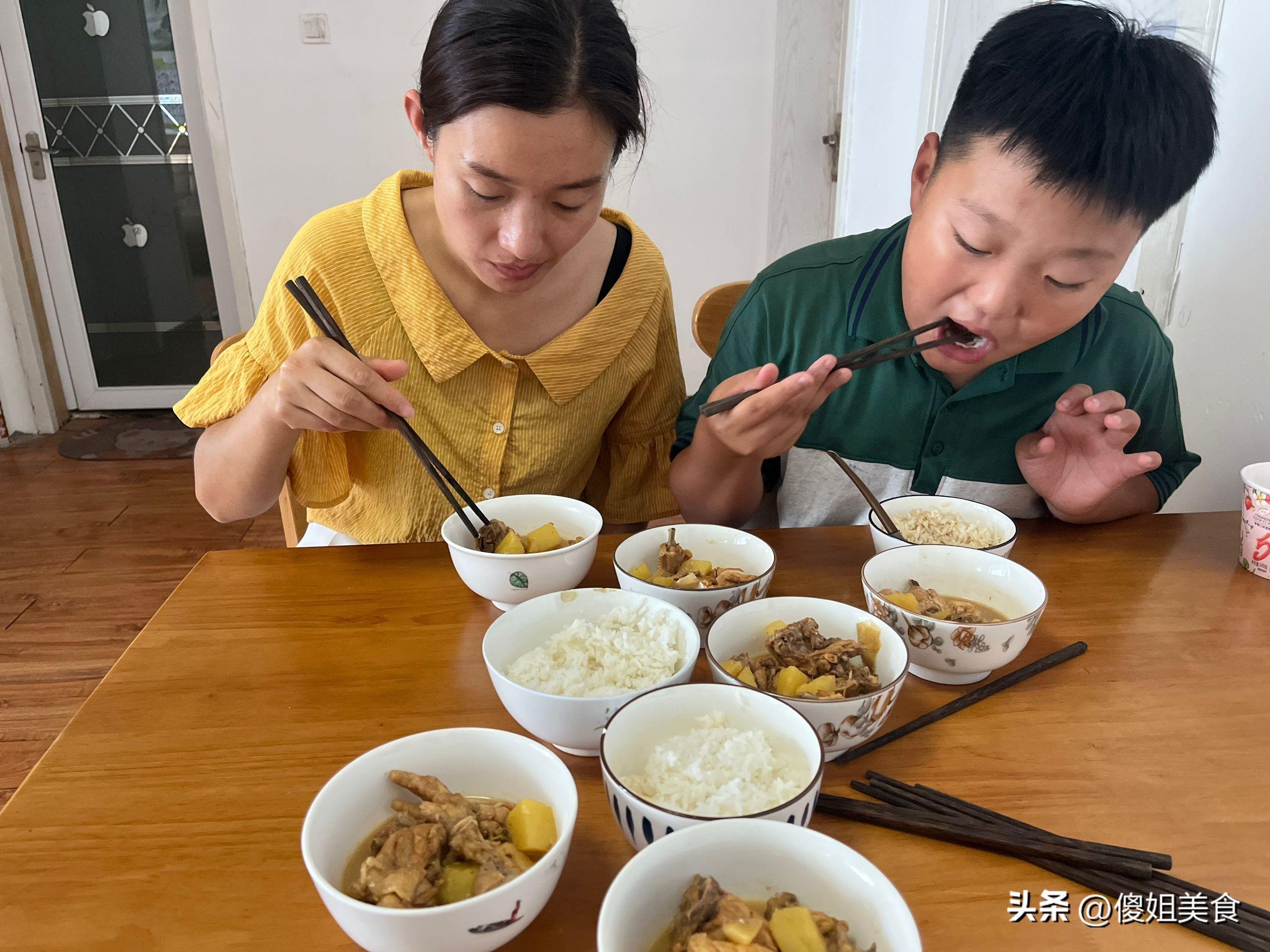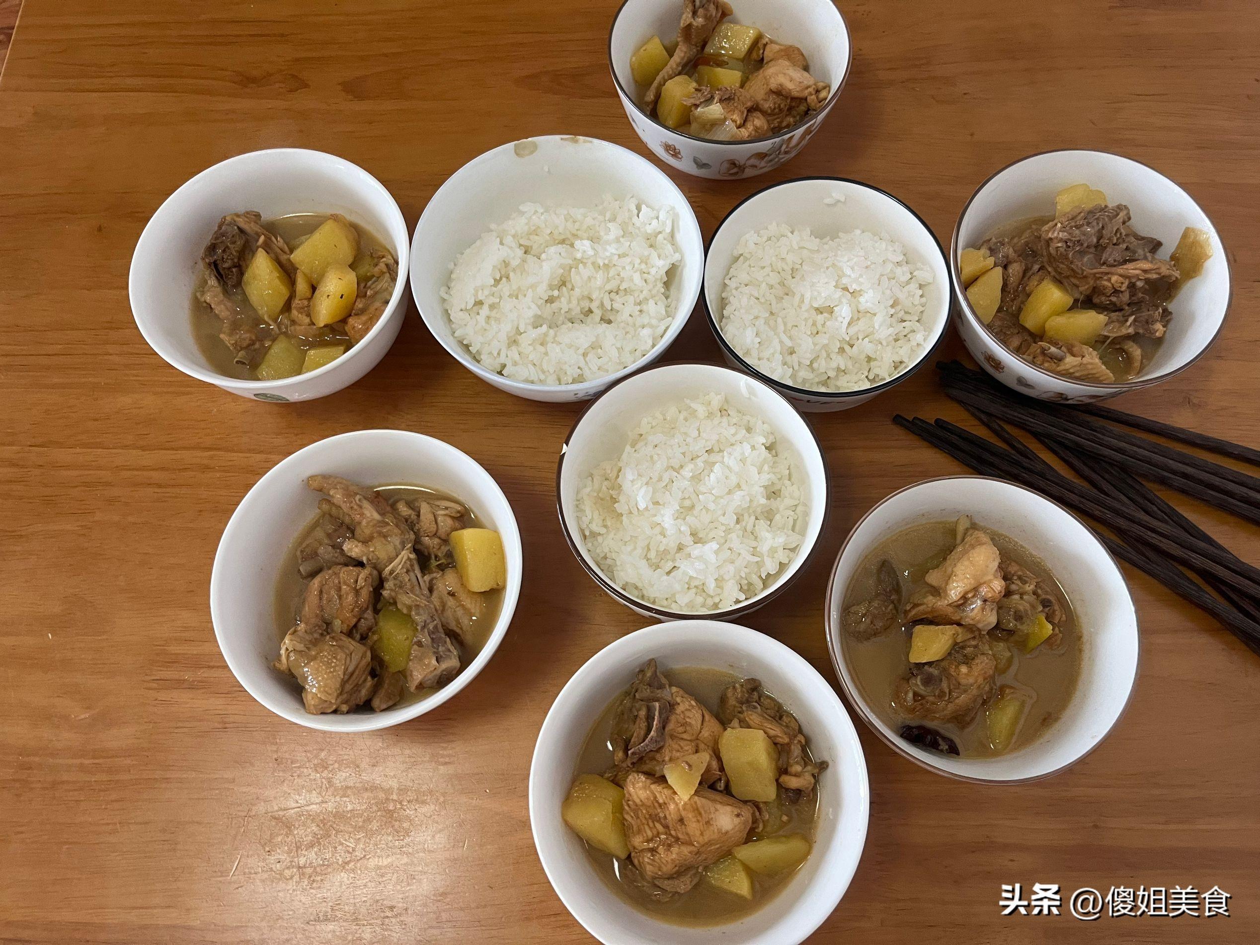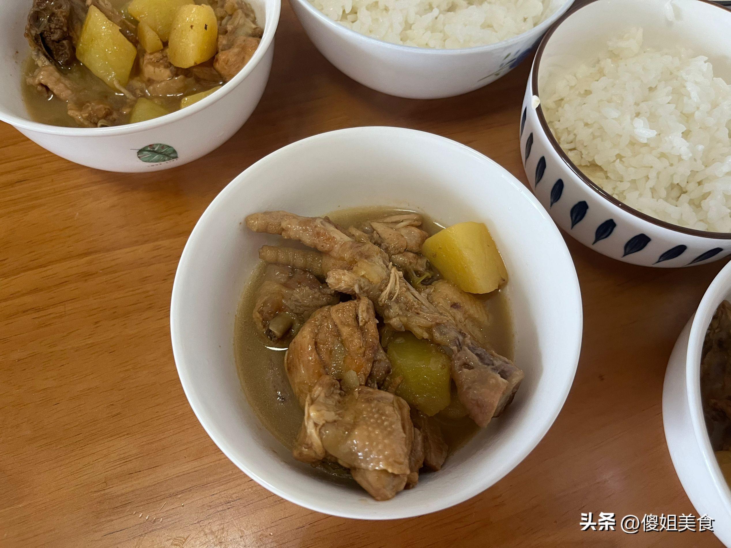 雞湯拌米飯很好喫,提前把淘洗乾淨的大米放入電飯煲,預約好蒸熟就可以,米飯蒸軟一些,好消化,也好喫。燉了滿滿一大鍋的土豆雞塊最後連湯汁都沒剩,我們四口人光盤行動,鮮香美味,好喫又解饞,太香了,改天還要喫。